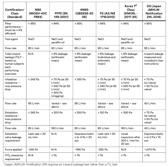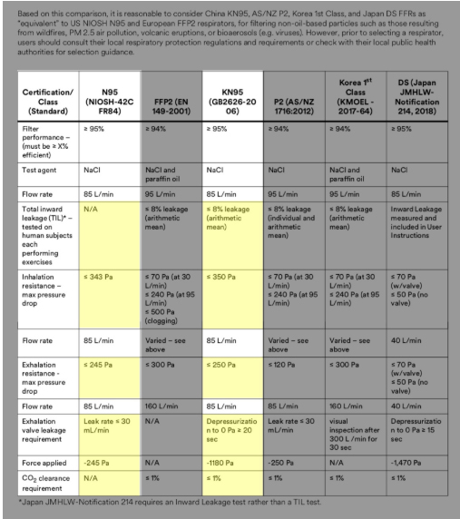US N95s. Mask standards for Europe (FFP2), Australia (P2), Korea (KMOEL), and